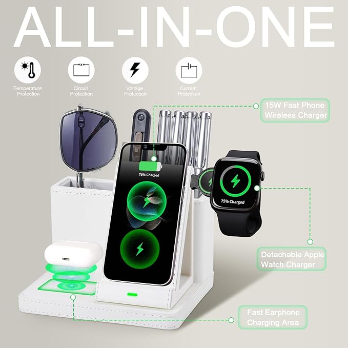 - 3-in-1 Wireless Charging Hub: Simultaneously charges your phone, earbuds, and smartwatch with fast wireless technology, keeping your workspace free of cable clutter.