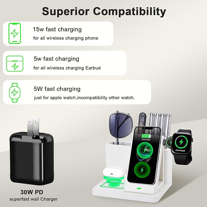 Leather Desk accessories Pen Holder with 3-in-1 Wireless Charger for Phone, Earbuds, Watch Multifunctional Desktop Phone Stand for Office and Home,birthday gifts,gifts for him (white)