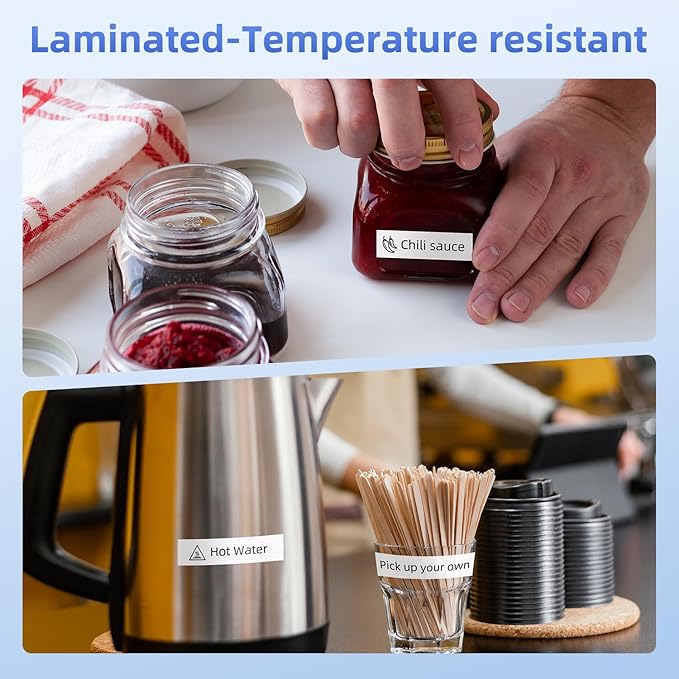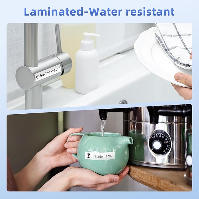 - Split back design makes it easy to peel off the backing. Strong adhesive but no glue residue when you remove it. Because it’s covered with a clear film when print finished, the laminated tz label is water-resistant, oil-resistant, UV-resistant, temperature-resistant, and rub-resistant. Difficult to fade.
