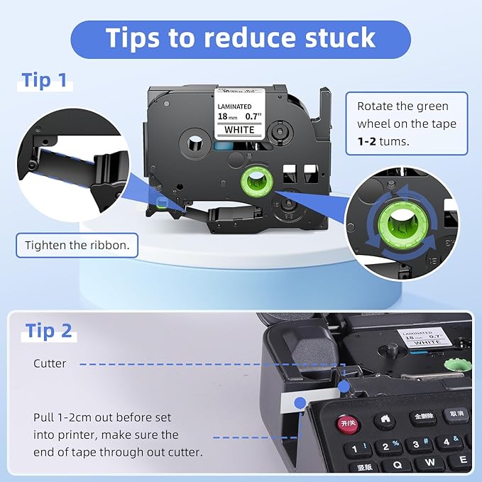 - Using tips: rotate the wheel in the direction of the arrow to tighten the tape before using it. Pull out the tape past the cutter 2-3cm that avoid jamming in the label maker. Folding the back of the tape is beneficial for removing the backing.