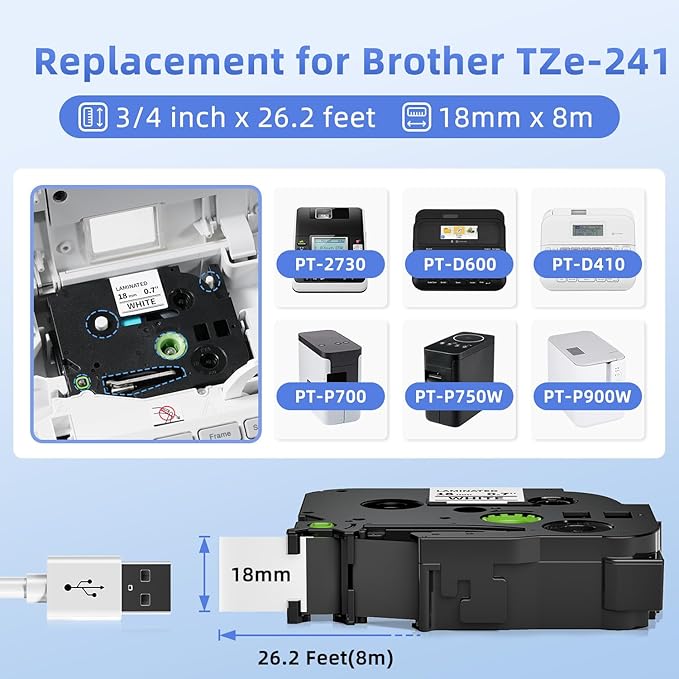 - Size: 18 mm x 8 m (3/4 inch x 26.2 ft), Color: black on white, Model: TZe-241,TZE241, TZ-241, TZ241, AZe-241.