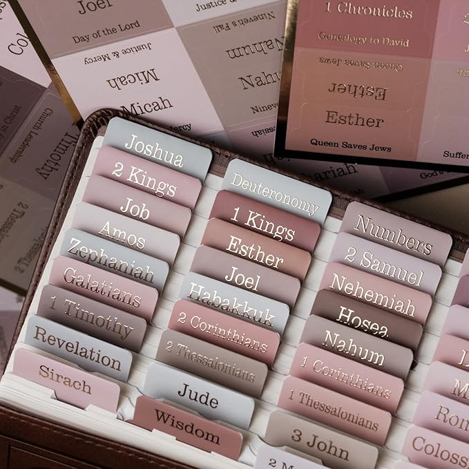 - Large Print, Easy to Read & Easy to Install:Silky velvet touch laminate,carefully designed pretty Bible accessories . The peel-and-stick Bible index tabs are self adhesive, simply align them with the provided guide or place them creatively.