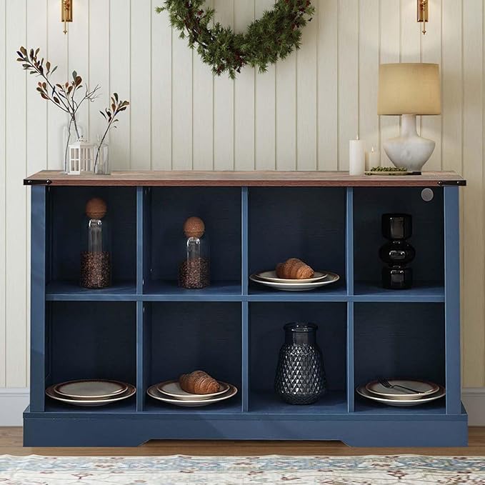 8 Cube Storage Organizer, 2 Tier Bookshelf for Living Room, Farmhouse Bookcase with Led, Kids Toy Storage Cabinet, Wall Cubby Shelves for Home Decor, Wood Display Cabinet for Bedroom, Blue