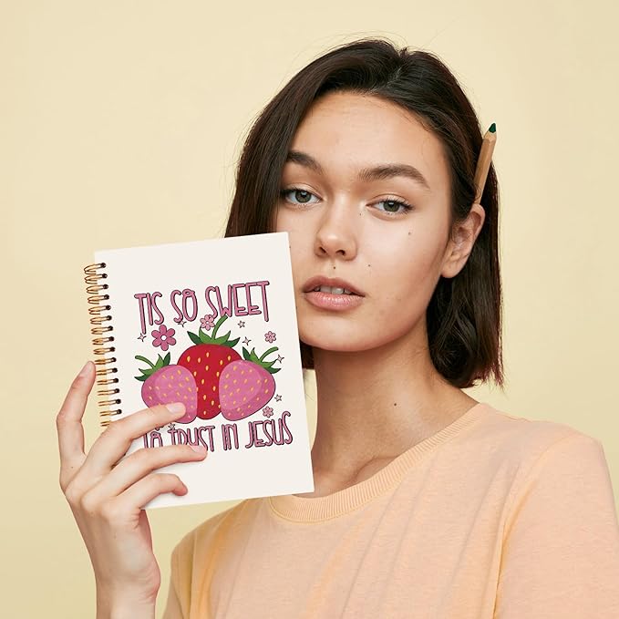 JXREQ Pink Strawberry Christian Bible Journal Notebook, Prayer Journal for Women, Scripture Journal, Church Notes Notebooks, Tis So Sweet to Trust Jesus 5.5x8.3
