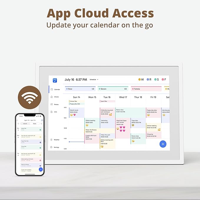 - 【Easy Setup and Auto-Sync】: Enjoy a user-friendly design that our smart picture frame allows for quick setup—just plug in, connect to Wi-Fi, and link your calendar to the Mobile App. Once synced, it seamlessly integrates multiple personal calendars (iOS, Google, etc.) into one unified interface. Authorize additional devices for even greater convenience.