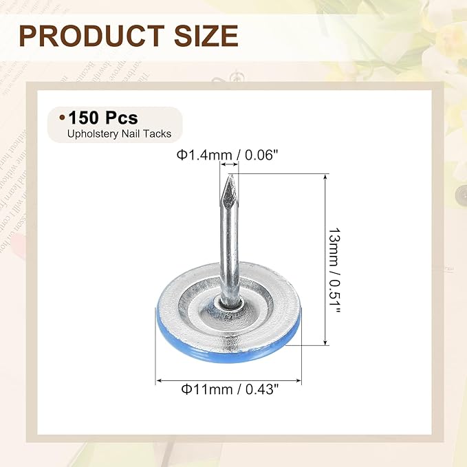 - [Size & Quantity] - The package comes with 150pcs decorative upholstery tacks. Sufficient quantity to meet your different daily needs. The overall size of upholstery nails is about 11mm x 13mm/0.43-inch x 0.51-inch(D*H)