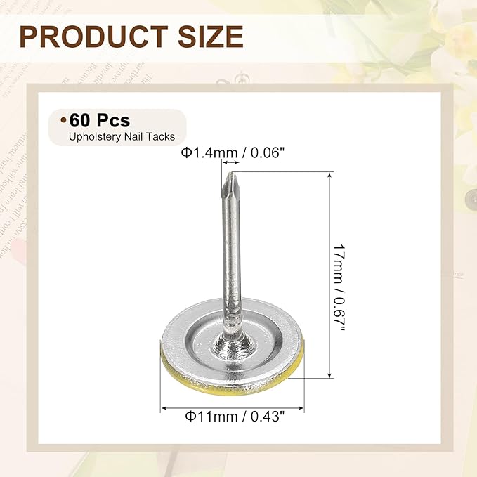 - [Size & Quantity] - The package comes with 60pcs decorative upholstery tacks. Sufficient quantity to meet your different daily needs. The overall size of upholstery nails is about 11mm x 17mm/0.43-inch x 0.67-inch(D*H)