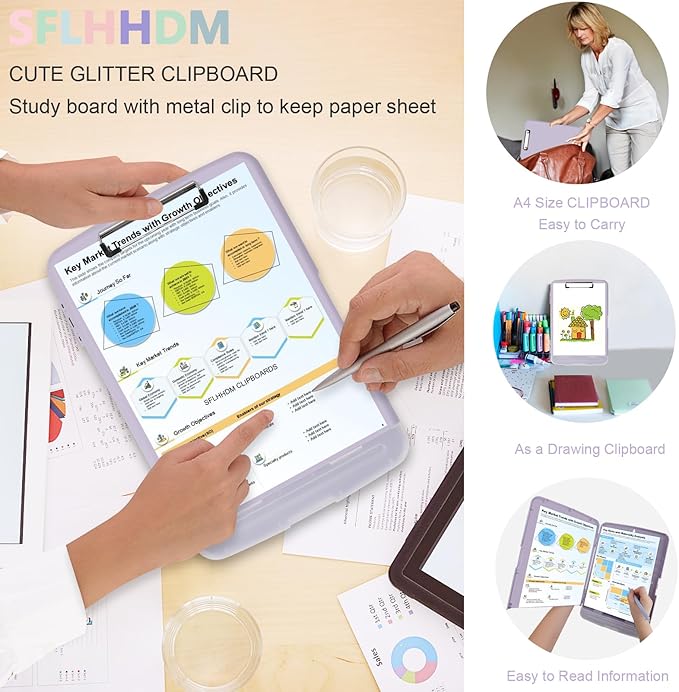 - Unique Design: Clip boards 8.5x11 with storage have a bright color, Classic design make this colorful clip boards more attractive. The ergonomic design of the grip is non-slip and comfortable. With this unique clipboard, your daily works are far more fun and easy