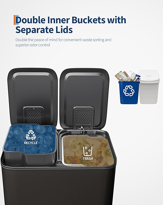 - [PRACTICAL DESIGN] – GarveeHome’s dual trash and recycling bins put ease of use first. Ergonomic side handles let you lift and relocate the entire unit effortlessly. The soft-close lid opens to 80° without collision with standard kitchen island edges, and locks at 95° for hands-free cooking prep and scrap disposal. Dual inner buckets with weighted-edge lids trap odors separately. A custom liner ring secures any standard bag snugly, eliminating slips, bunching, and overhang