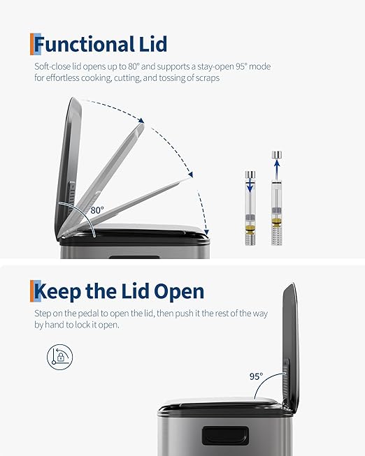- [PRACTICAL DESIGN] – GarveeHome’s dual trash and recycling bins put ease of use first. Ergonomic side handles let you lift and relocate the entire unit effortlessly. The soft-close lid opens to 80° without collision with standard kitchen island edges, and locks at 95° for hands-free cooking prep and scrap disposal. Dual inner buckets with weighted-edge lids trap odors separately. A custom liner ring secures any standard bag snugly, eliminating slips, bunching, and overhang