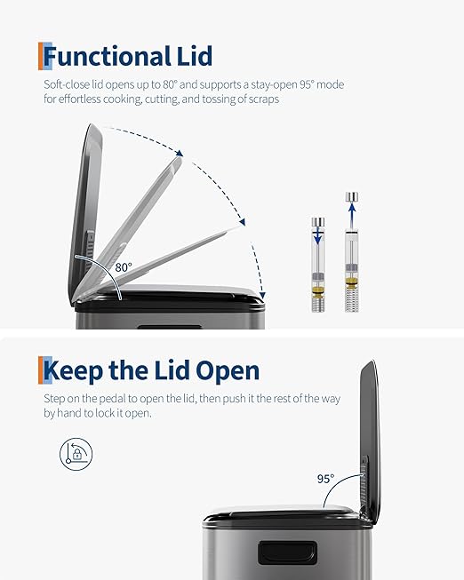 - [PRACTICAL DESIGN] – GarveeHome’s dual trash and recycling bins put ease of use first. Ergonomic side handles let you lift and relocate the entire unit effortlessly. The soft-close lid opens to 80° without collision with standard kitchen island edges, and locks at 95° for hands-free cooking prep and scrap disposal. Dual inner buckets with weighted-edge lids trap odors separately. A custom liner ring secures any standard bag snugly, eliminating slips, bunching, and overhang