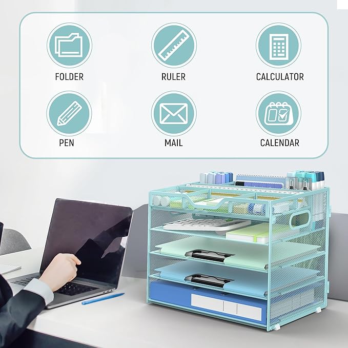 - Sturdy Metal Construction with Powder Coated Finish-This blue 5-tier desk organizer is crafted from durable metal with a sleek powder-coated finish, ensuring long-lasting strength and resistance to wear. The premium office desk organizer material provides stability while maintaining a modern, professional look perfect for any desk or office setting. An essential addition to your desk organizers and accessories collection