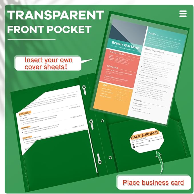 - Practical and Useful: with a clear front pocket, you can put your catalog, tables, favorite reports, presentations and more for clear display; Each plastic folder has 2 internal pockets to help organize and store your letter sized paper and documents, there are also 3 prongs to secure your 3-hole loose leaf paper, and the card slot can hold your ID card or business card, practical for your daily work