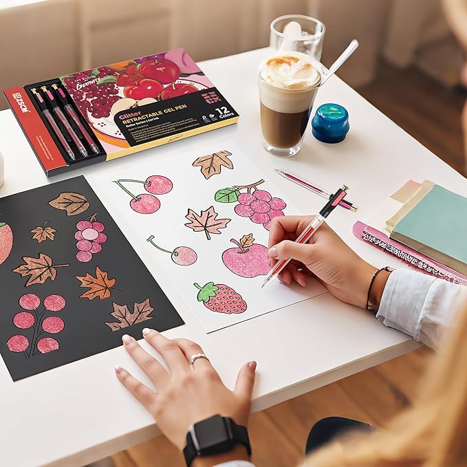 - Perfect Gift & Portable Storage:This 12-piece retractable glitter gel pen set comes in a deluxe drawer-style box with molded tray to securely hold each glitter pen. Perfectly packaged for gifting to artists, crafters, and stationery enthusiasts. The anti-slip tray keeps pens organized whether at home, office, or on-the-go - ready to spark creativity anytime!