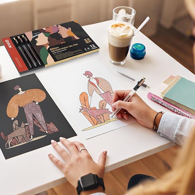 - Perfect Gift & Portable Storage:This 12-piece retractable glitter gel pen set comes in a deluxe drawer-style box with molded tray to securely hold each glitter pen. Perfectly packaged for gifting to artists, crafters, and stationery enthusiasts. The anti-slip tray keeps pens organized whether at home, office, or on-the-go - ready to spark creativity anytime!