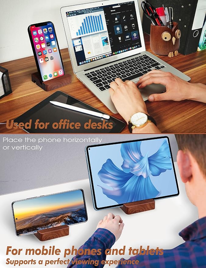 - [Creative Design]: This is a cute ebony owl pen holder with personalized design. The owl symbolizes wisdom and rationality. The magnetic eyes can rotate 360°, which is vivid, interesting and fun to relieve stress. The pen holder is well-made, very durable, and has a large-caliber design that can hold more than 30 pens or pencils.The mobile phone holder is made of walnut, with a simple design and card slots of different sizes suitable for mobile phones of different thicknesses.