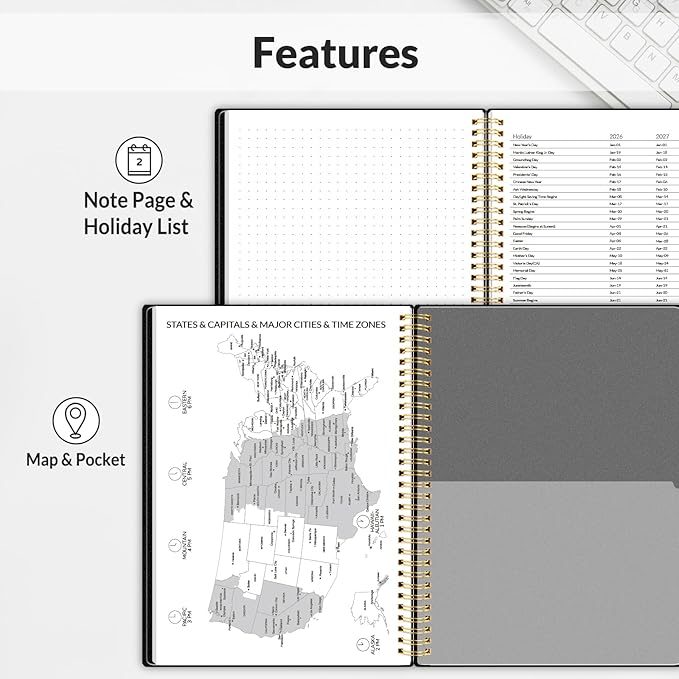 - ADDITIONAL FEATURES: 2026 daily weekly and monthly planner includes 2026-2027 Calendars; Quick Reference; Contact pages; Important Dates for 2026 yearly schedule; Monthly Section; Weekly Section included Dotted Notes pages; Holiday lists; Inner Pocket. Keep you organize throughout the year and easy to use!