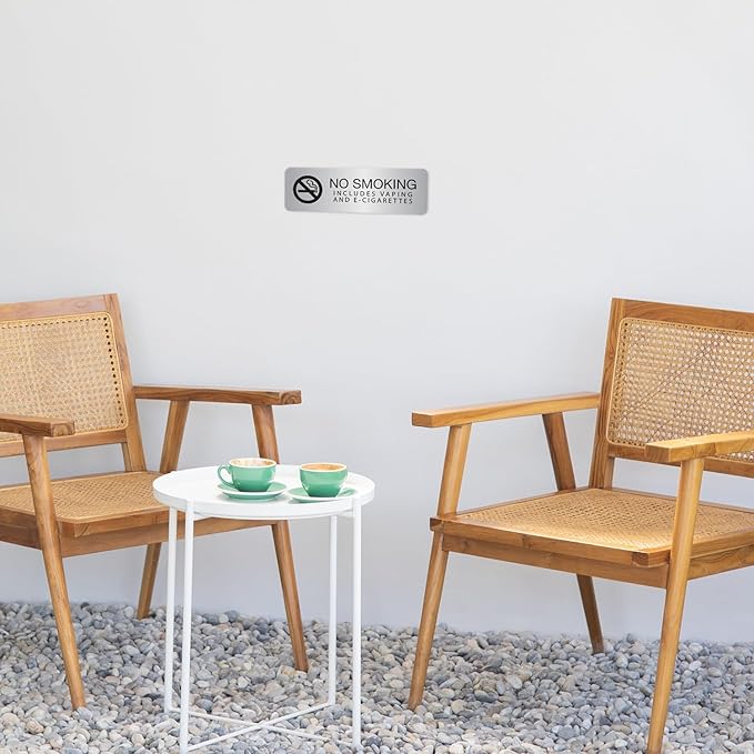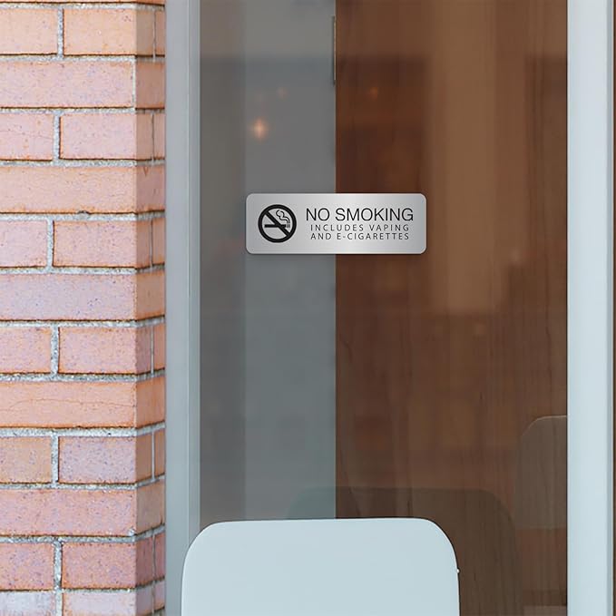 - Includes: One "No Smoking Includes Vaping and E-Cigarettes" sign in silver with adhesive mounting strips.