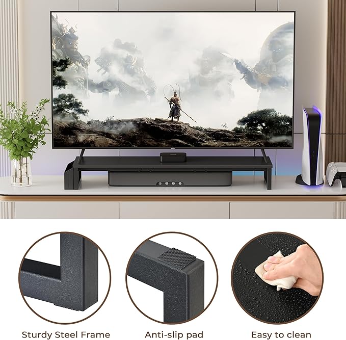 - 【Ergonomic Height】The desk monitor riser can adjust the monitor height to eye level, reducing neck and eye strain, improving posture, and enhancing focus and work efficiency.