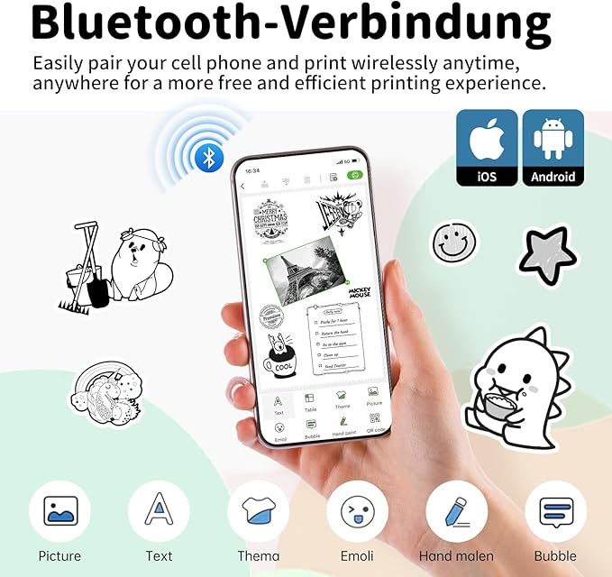 - Small & Compact Design: Our portable mini printer is a compact stickers makers, with bluetooth printer for iPhone and Android compatibility, perfect for student, professional, and DIY lover. Easily carry this sticker printer in your bag or pocket to print study notes, label, or to-do list anytime, anywhere