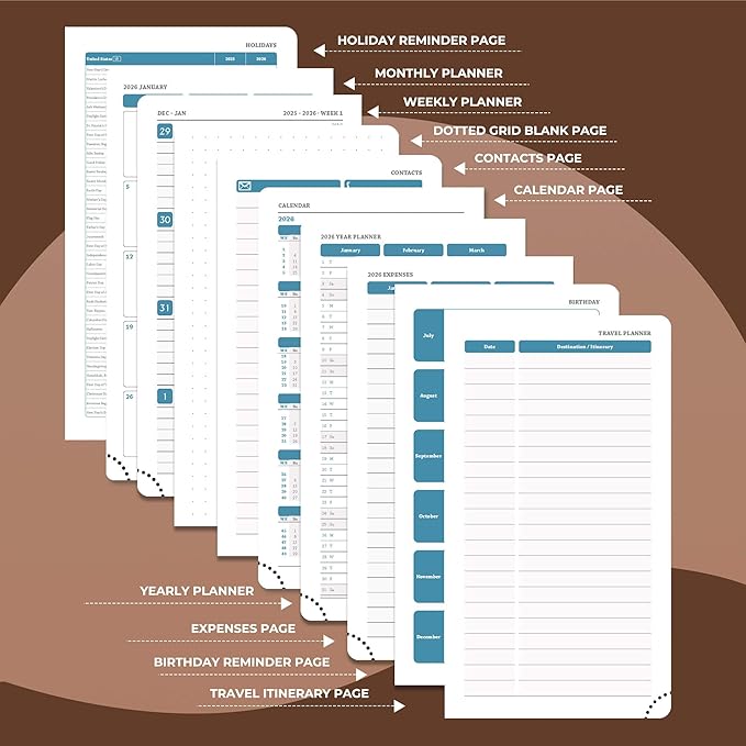 - Great Material for Weekly Planner: Crafted with FSC-100gsm thick paper that resists ink bleed and daily wear, this 2026 planner ensures smooth writing with markers while gentle on your eyes through its ivory white pages. The Vegan leather soft cover and reinforced lay-flat binding make it a calendar planner companion for busy professionals, students, and families