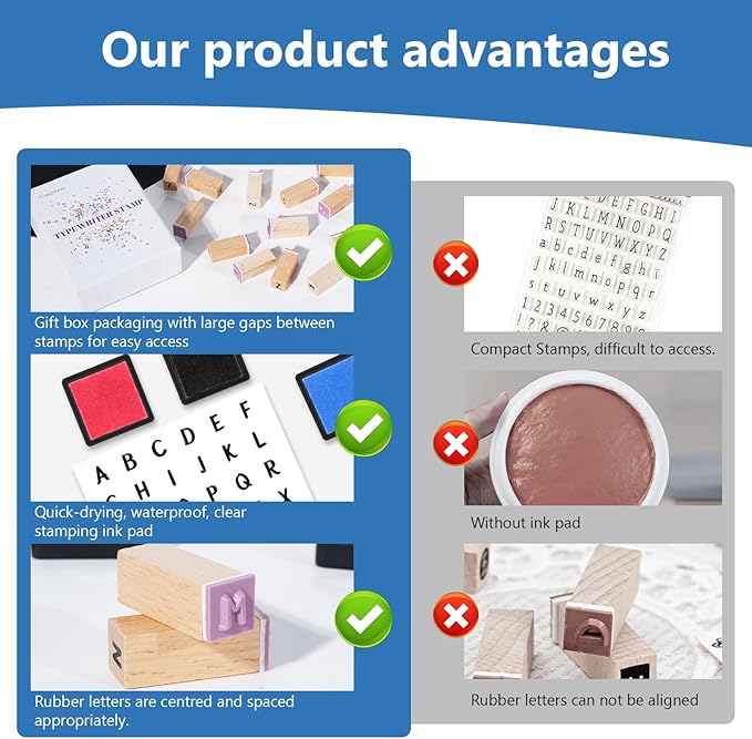 - 【Exquisite Craftsmanship】Each letter is 2mm deep so that the edges won't be stamped. It's always the same size and centered, with smooth edges. The marks on the wooden stamps handle are the same as the stamp letters, you can see them easily. The alphabet stamps for crafting in the box are organized without confusion