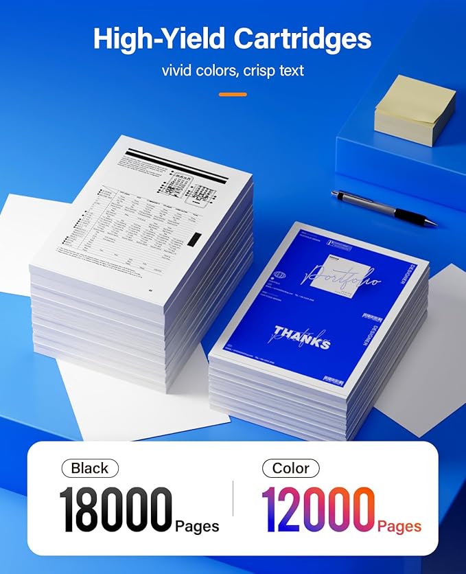 - High Page Yield: 18,000 pages for Black and 12,000 pages for Color toner cartridge (Letter/A4, at 5% coverage).