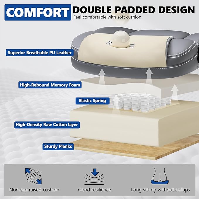 - Sturdy & Durable:Heavy-duty metal base supports up to 300 lbs. Reinforced with SGS-certified Grade 3 gas lift and 360° silent swivel casters for stability and smooth mobility. Explosion-proof base ensures long-lasting reliability.