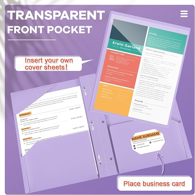 - Practical and Useful: with a light purple plastic folder, you can put your catalog, tables, reports, presentations and more for display; Each one has 2 internal pockets to help organize and store your letter sized paper and documents; There are also 3 prongs to secure your 3-hole loose leaf paper in case it falls, and the card slot can hold your ID card or business card, practical for your daily work