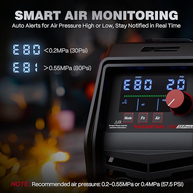 - [SMART AIR PRESSURE DETECTION] Equipped with an intelligent air pressure monitoring system that continuously measures and displays real-time pressure on the screen. The system instantly alerts you if the pressure is too high, too low, or unstable, ensuring safer and more efficient cutting. Before each use, you can manually switch to air pressure detection mode to check if the pressure is within the normal range. [Recommended pressure: 0.3–0.55 MPa or 0.4 MPa (57.5 PSI)]