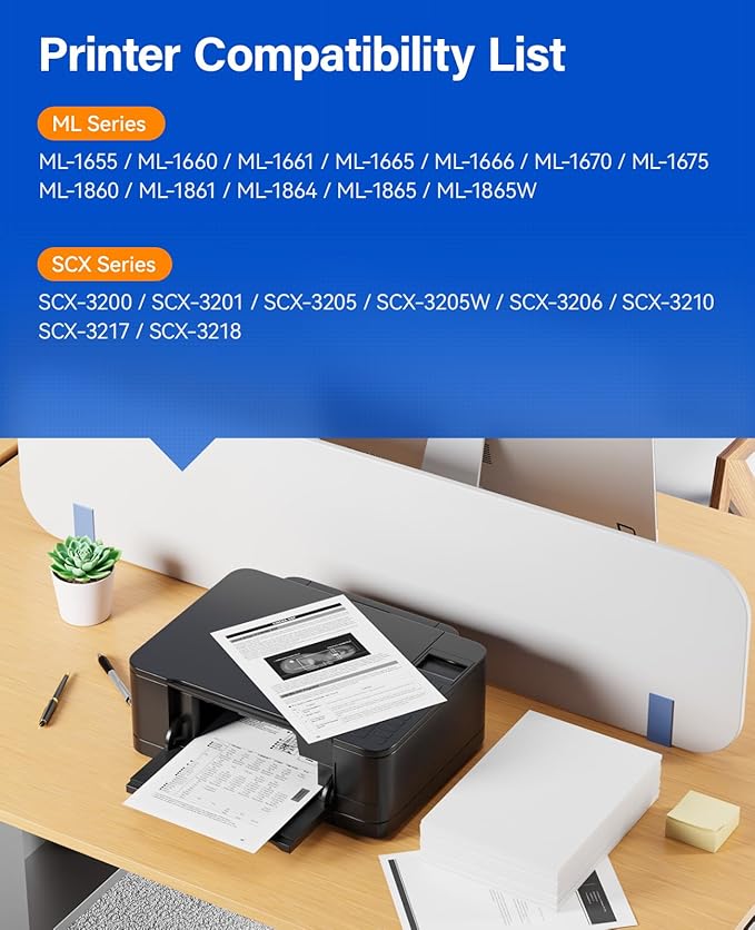 - Compatible Printer: Compatible with Samsung ML-1655, ML-1660, ML-1661, ML-1665, ML-1666, ML-1670, ML-1675, ML-1860, ML-1861, ML-1864, ML-1865, ML-1865W, SCX-3200, SCX-3201, SCX-3205, SCX-3205W, SCX-3206, SCX-3210, SCX-3217, SCX-3218 Series Printers.
