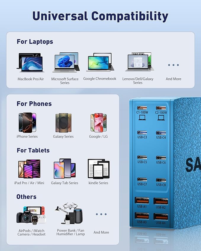 - 【Universal Compatibility】Our USB C charging station is equipped with 2*100W and 2*65W fast charging ports, which can charge 3 or more laptops at the same time. Compatible with smartphones, tablets and laptops, suitable for MacBook Pro/Air, Dell XPS, iPad Pro, iPhone 16/16 Pro Max, iPhone 15 Pro Max, iPhone 14/13 Pro/12 Pro Max, iWatch, AirPods, Surface Pro, Galaxy S24 Ultra, Switch, Steam Deck, Google Pixel and many other devices.