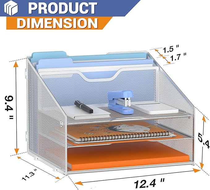 - Dimensions: 12.4"L x 11.3"W x 9.4"H, each horizontal tray :12.4" x 8.05" x 2.2" inch(L x W x H); 2 file holder: 12.4" x 9.4" x 1.5" inch(L x H x W)