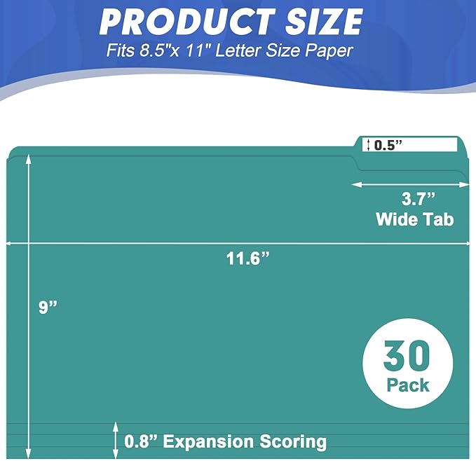 File Folder, HERKKA 30 Pack 1/3 Cut Tab File Folders, File Folders Great for Organizing and Filing, Letter Size, Turquoise