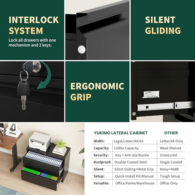 - 【Anti-tilt System】: This 2 drawer lateral file cabinet with lock meet your needs. It has has a anti-tilt design, ensuring that only one drawer can be open at a time. By preventing multiple drawers from being open simultaneously, the office cabinet maintains stability and greatly reduces the risk of tipping. You can have peace of mind knowing that your documents and equipment are secure.