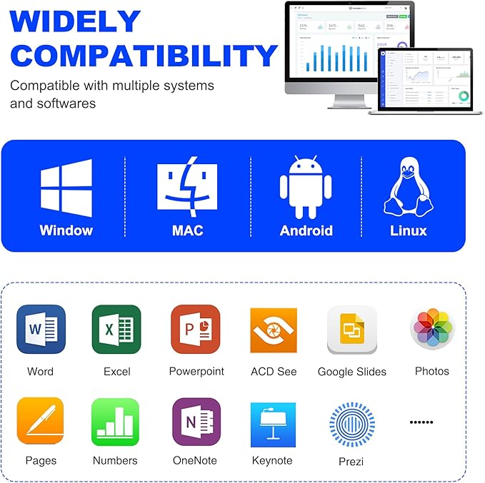 - Dual USB-A & USB-C Connectivity for Universal Compatibility - This white wireless presenter clicker supports both USB-A and USB-C ports, ensuring seamless compatibility with a wide range of devices, including Mac, Windows laptops, PCs, and more.Just plug and play for effortless presentations