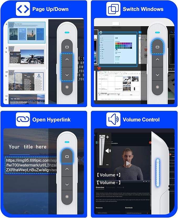 - Intuitive Controls for Smooth Presentations - Take command of your slides with ease! The white presentation remote offers essential functions like page forward/backward, volume adjustment, window switching, full/black screen mode, and hyperlink navigation.Efficient for professionals, educators, and speakers
