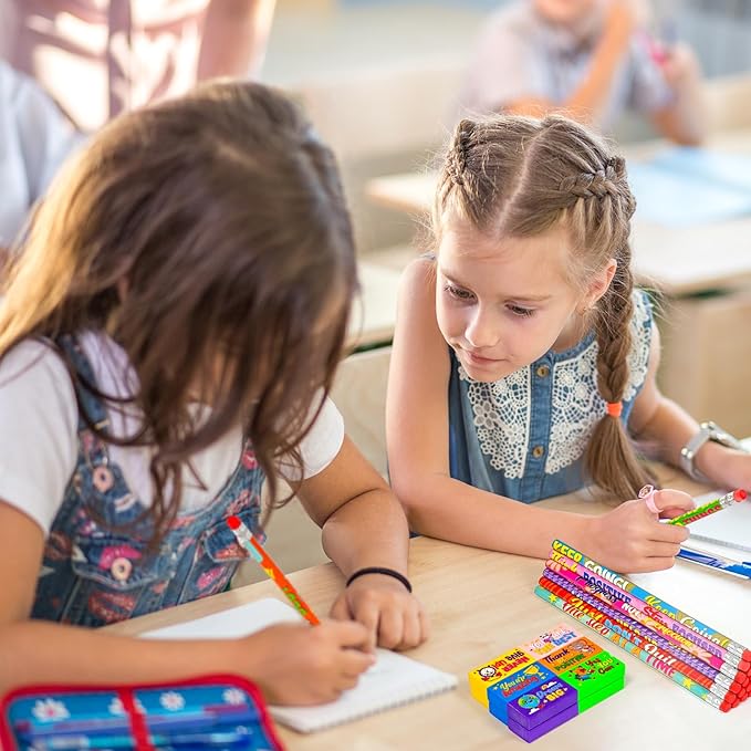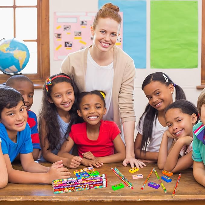 - 100 Motivational Pencil and Eraser Set:Includes 50 inspirational pencils and 50 adorable erasers, perfect for classroom rewards, party favors, or back-to-school surprises. A generous bulk quantity to meet the needs of teachers, parents, and event organizers