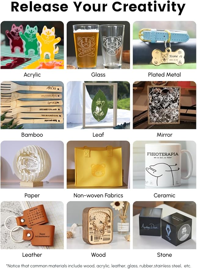 - Pro-Level Features, Plug-and-Play Simplicity Ready to use right out of the box—no assembly! Connect via USB-C, WiFi, or accessory ports. Compatible with popular design software and preloaded templates. Engrave offline or control via smartphone/tablet. Ideal for educational projects, custom merchandise, or organizational labels. Adjust the laser height for materials up to 134mm tall. Includes multi-language support and step-by-step tutorials.