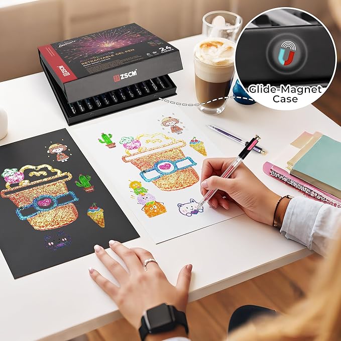 - Perfect Gift & Portable Storage:This 24-piece retractable glitter gel pen set comes in a premium magnetic closure box with molded tray to securely organize each pen. Perfectly packaged for gifting to artists, students, and stationery enthusiasts. The anti-slip tray keeps pens organized whether at home, office, or on-the-go - ready to spark creativity anytime!