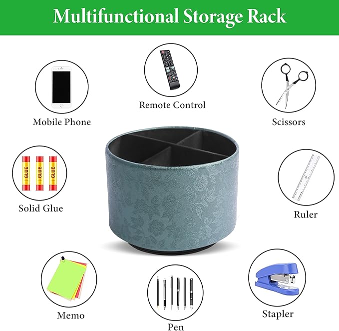 lizimandu Round Leather Art Supply Organizer,Remote Control Holder,360 Degree Spinning,Multi-Functional Pencil Holder,4 Compartments Desktop Stationary Organizer(1-Liuli Green)