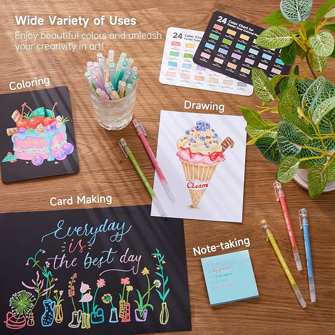 - 24 PASTEL TONE COLORS & 2 COLOR SHEETS: Shuttle Art colored pen set comes with 24 pastel colors. Soft and cute colors look stunning on paper, especially standing out on black paper. Additionally, it contains 2 bonus color sheets. A hassle-free choice for your creating.
