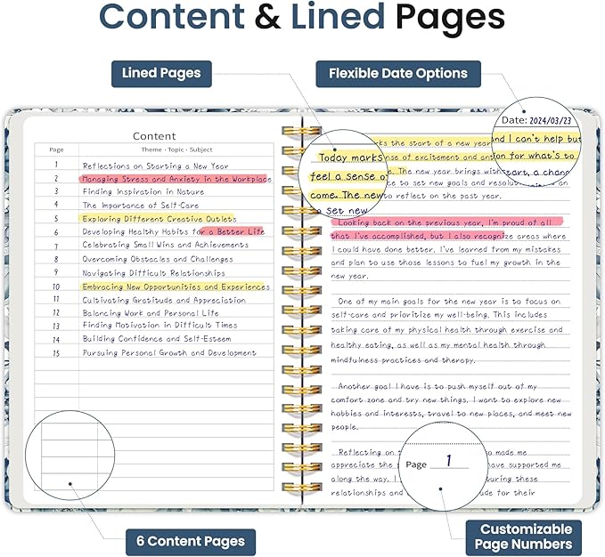 - Structured College-Ruled Pages: Featuring 7mm college-ruled lines, this journal notebook helps keep your writing organized and legible. The evenly spaced lines are perfect for structured notes, work lists, or detailed writing, making it an excellent choice for school students, professionals, and writers alike. It also includes 6 content pages, perfect for creating an index for easy reference.