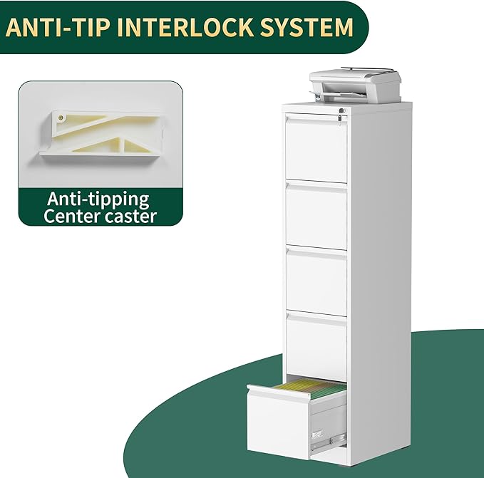 - 【Privacy Security and Anti-tilt Design】The interlock system secures the 5 drawers and comes with two keys to protect your files. The anti-tilt system ensures that only one drawer can be open at a time, preventing the metal file cabinet from tipping over. You can have peace of mind knowing that your important documents and items are safe and secure.