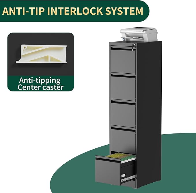- 【Privacy Security and Anti-tilt Design】The interlock system secures the 5 drawers and comes with two keys to protect your files. The anti-tilt system ensures that only one drawer can be open at a time, preventing the metal file cabinet from tipping over. You can have peace of mind knowing that your important documents and items are safe and secure.