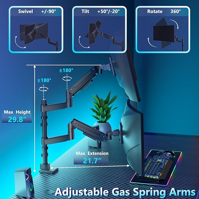 - Flexible Adjustability: Dual Monitor Mounts with a stable gas spring, it offers a screen tilt of +50°/-20°, +/-90° swivel, and 360° rotation. This height flexibility in the monitor stand allow for various screen stacking ways, and 18.9'' of smooth height adjustment with gas spring lift. This height flexibility in the dual monitor arms allow for various screen stacking ways, providing more comfortable experience whether you are gaming or watching matches.
