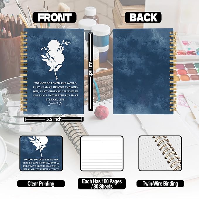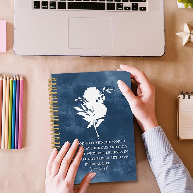 XPH Blue Christian Spiral Notebook, John 3:16 Bible Verse Journaling Notebooks for Women, Floral Religious Hardcover Journals for Writing 160 Pages 5.5 x 8.3 Inch, Christian Gifts for Women