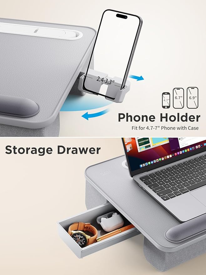 - Built-in Storage Drawer & Phone Holder Lap Tray: This laptop tray table is designed with a concealable drawer and a phone holder on the sides. They are both designed to save space when not in use. You can store necessary small items on the drawer such as pencils, a remote, earphones, keys, glasses, etc. when working on a bed or couch. The side phone holder allows you to stay connected while working or coloring.