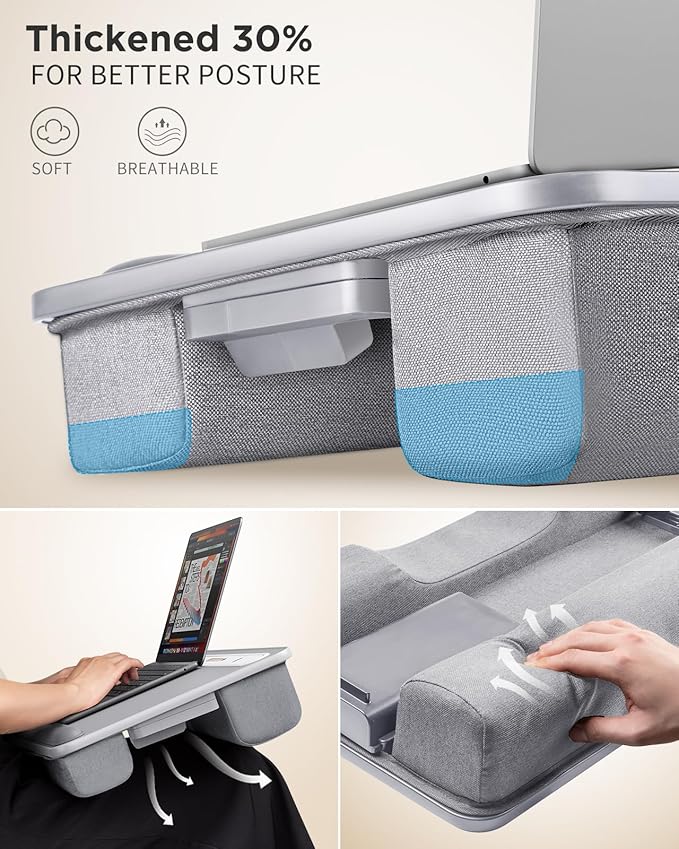 - Thickened Lap Desk Cushions: The SAIJI Laptop Lap Desk is designed with a 30% thicker, soft cushion on the bottom. This laptop tray allows for a better angle when using a laptop and creates a larger space for airflow and heat dissipation.