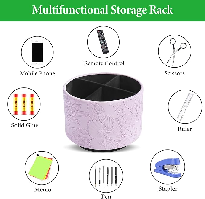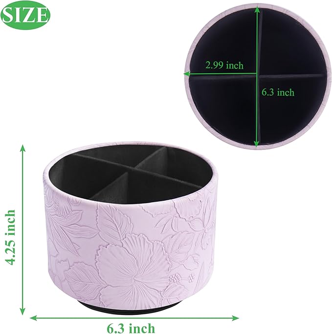 Hennaja Round Leather Art Supply Organizer,Remote Control Holder,360 Degree Spinning,Multi-Functional Pencil Holder,4 Compartments Desktop Stationary Organizer(1-Carved Purple)